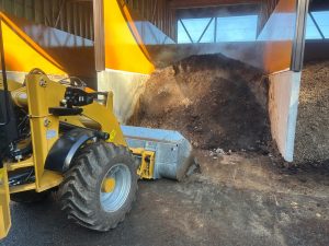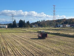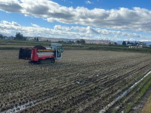 里芋の袋詰めもまだ残っていますが、天気も良いので本日より堆肥の秋散布を始めました。稲わらを販売している畜産農家より春から堆肥を毎日搬入してもらい、当園の堆肥舎で切り返しをしながら堆肥を作ってきました。出来上がった堆肥を土作りと肥料として田んぼに散布していきます。田んぼによって地力も違いますし、栽培する銘柄も考えながら1枚1枚適正な量を撒くように心がけています。化成肥料の減肥にもつながる為、当園には欠かせない作業です。堆肥の運搬と散布2人がかりで作業しますが、今月中には終わらせたいので、まだ雪が降らない事を祈ります・・・