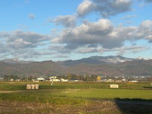 遠くに見えるのは飯豊山です。もう真っ白ですね⛄